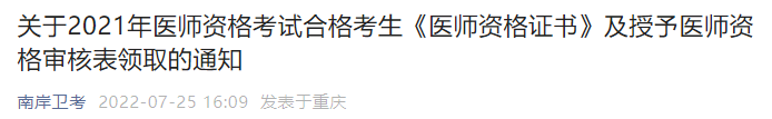 重慶市南岸考點(diǎn)2021年醫(yī)師資格考試合格考生《醫(yī)師資格證書》及授予醫(yī)師資格審核表領(lǐng)取的通知