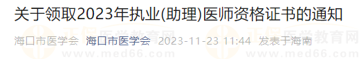 海口市2023年執(zhí)業(yè)(助理)醫(yī)師資格證書開始領(lǐng)取啦!請(qǐng)相關(guān)考生及時(shí)關(guān)注后續(xù)消息,具體內(nèi)容如下: