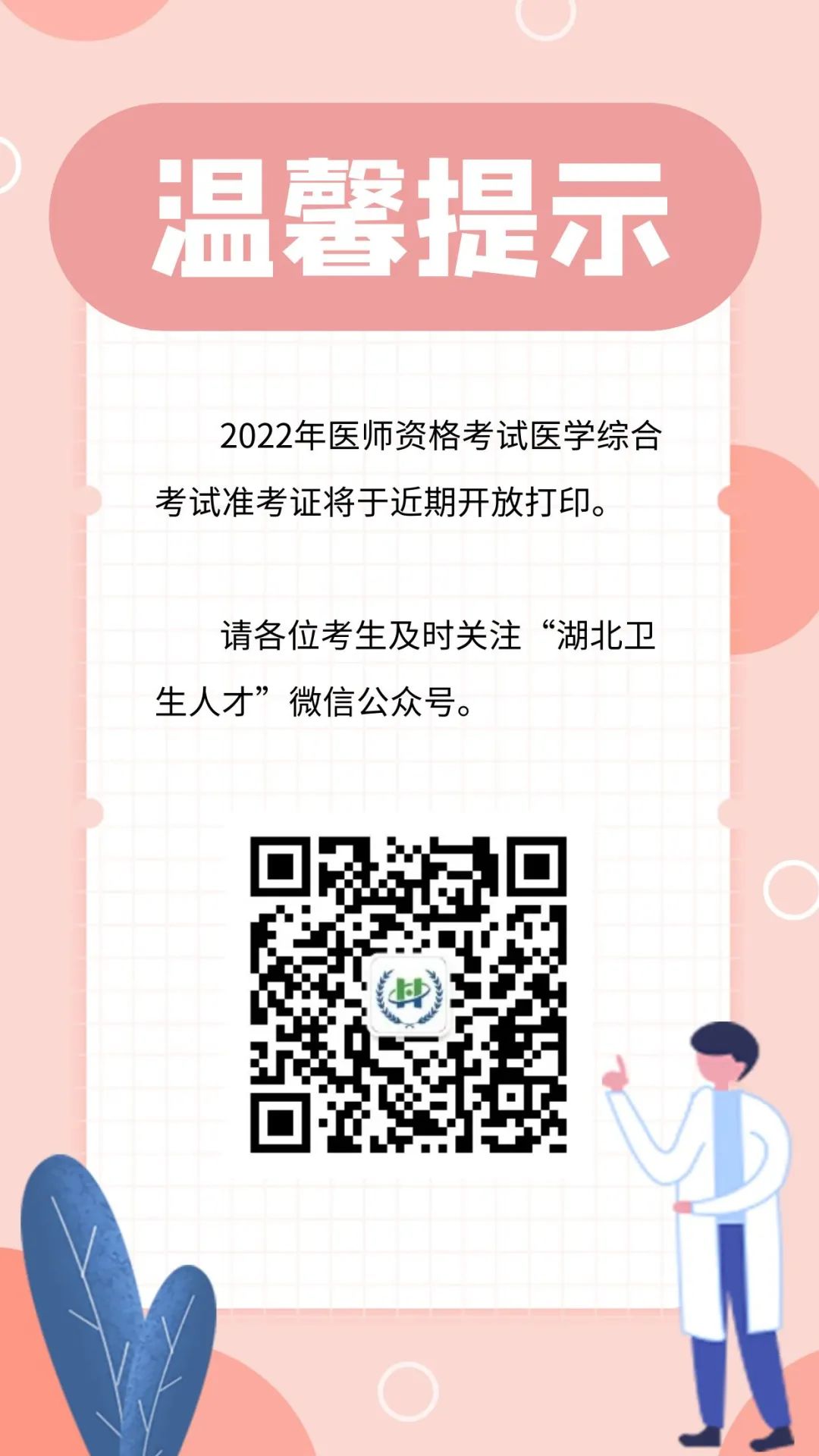 2022年醫(yī)師資格考試醫(yī)學(xué)綜合考試準(zhǔn)考證將于近期開放打印。請(qǐng)各位考生及時(shí)關(guān)注“湖北衛(wèi)生人才”微信公眾號(hào)。