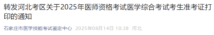 河北石家莊2025年醫(yī)師資格綜合筆試準(zhǔn)考證8月15日起打??!