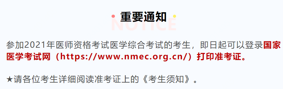南京醫(yī)學會重要通知:參加2021年醫(yī)師資格考試醫(yī)學綜合考試的考生,即日起可以登錄國家醫(yī)學考試網(wǎng)(https://www.nmec.org.cn/)打印準考證。