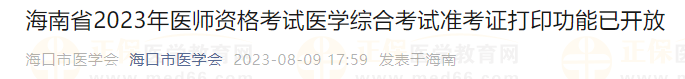 海南省2023年醫(yī)師資格考試醫(yī)學(xué)綜合考試準考證打印功能已開放!