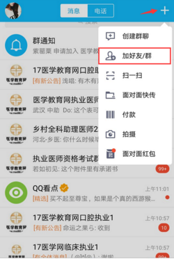 方法二:打開(kāi)手機(jī)qq,點(diǎn)擊屏幕右上角“+”標(biāo)識(shí),添加群