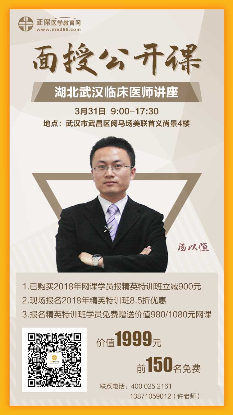 醫(yī)學(xué)教育網(wǎng)2018年臨床執(zhí)業(yè)/助理醫(yī)師面授班公開課將于3月31日在湖北武漢開講,網(wǎng)校老師湯以恒將親臨現(xiàn)場(chǎng)授課。此次公開課湯老師將重點(diǎn)講解2018年臨床執(zhí)業(yè)/助理醫(yī)師考試的科學(xué)復(fù)習(xí)方法和重點(diǎn)、難點(diǎn)、考點(diǎn)以及考情等重要知識(shí)。請(qǐng)各位考生朋友準(zhǔn)時(shí)到場(chǎng)參加,一起領(lǐng)略醫(yī)學(xué)教育網(wǎng)的老師風(fēng)采。