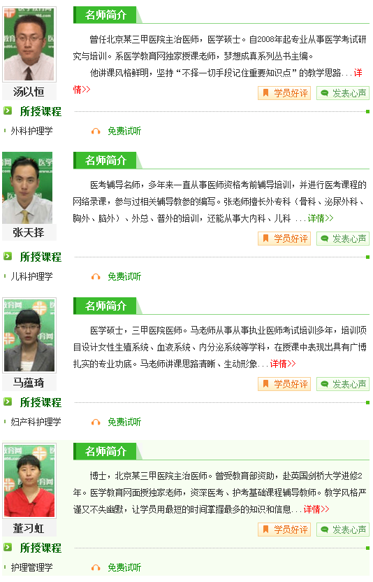 以下幾位是醫(yī)學(xué)教育網(wǎng)主講主管護(hù)師的名師,希望詳情更多名師請(qǐng)點(diǎn)擊圖片查看。還可以免費(fèi)試聽各位講師的課程。想學(xué)習(xí)更多醫(yī)學(xué)考試內(nèi)容請(qǐng)查看主管護(hù)師輔導(dǎo)招生方案,一定會(huì)有適合你去學(xué)習(xí)的課程。