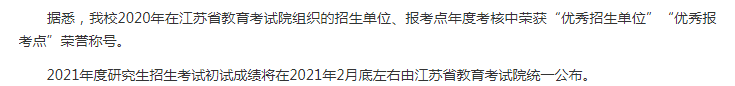 2021年度研究生招生考試初試成績將在2021年2月底左右由江蘇省教育考試院統(tǒng)一公布。