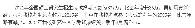 2021年全國碩士研究生招生考試報考人數(shù)為377萬,比去年增長36萬,再創(chuàng)歷史新高。報考我??忌?cè)藬?shù)為12215名,其中在我??键c(diǎn)參加考試的考生為2585名,比去年略有減少。2021年我校研究生入學(xué)考試成績預(yù)計明年2月底公布。