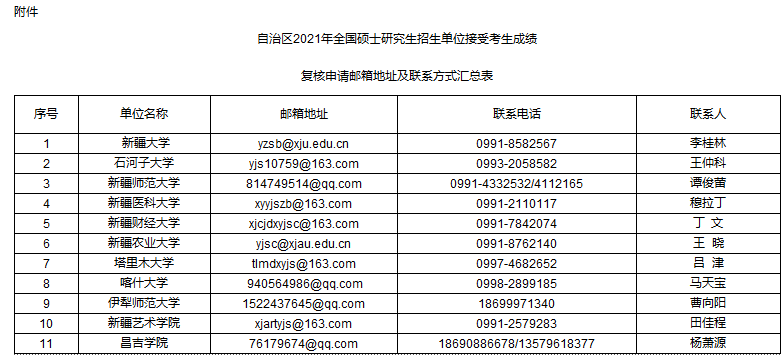 考生如對(duì)本人成績(jī)有疑問(wèn),可在復(fù)核成績(jī)申請(qǐng)時(shí)間內(nèi)按照招生單位公布的成績(jī)復(fù)核申請(qǐng)方式和相關(guān)要求(詳見(jiàn)各招生單位公告)提出成績(jī)復(fù)核申請(qǐng)。各招生單位接受考生成績(jī)復(fù)核申請(qǐng)的郵箱地址和聯(lián)系方式見(jiàn)附件。
