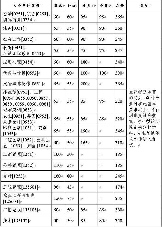 1.總分成績(jī)不低于上表中復(fù)試分?jǐn)?shù)線基本要求的總分,滿分為100分的科目成績(jī)不低于50分,滿分為150分的科目成績(jī)不低于75分,滿分為200分的科目成績(jī)不低于100分,滿分為300分的科目成績(jī)不低于150分,符合上述條件的考生可參加退役大學(xué)生士兵專項(xiàng)計(jì)劃的復(fù)試。