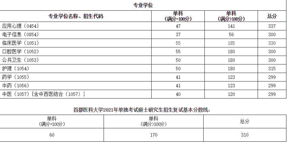 2021年考研的國家線已經(jīng)公布了!各位報考了首都醫(yī)科大學(xué)的考生及時了解院校發(fā)布的分數(shù)線基本要求,醫(yī)學(xué)教育網(wǎng)小編在首都醫(yī)科大學(xué)的官網(wǎng)上搜集到了“首都醫(yī)科大學(xué)2021年碩士研究生招生復(fù)試基本分數(shù)線”,整理如下: