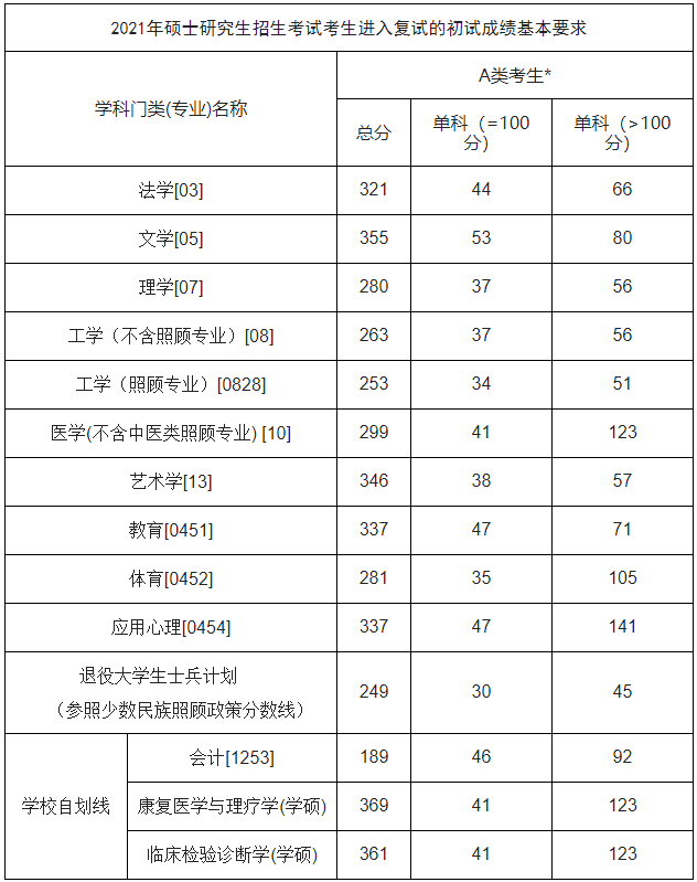 2021年我校擬招生1000人(含退役大學生士兵計劃7人),具體招生人數(shù)以國家下達招生計劃為準。各招生學科復試分數(shù)線不得低于國家復試合格線A類線,可以提高復試分數(shù)線: