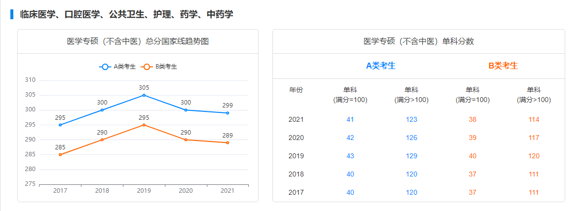 大家可以看到,近5年的考研分數線在醫(yī)學專業(yè)方面,專碩和學碩的分數線是一致的,2017年到2018年上漲5分,到2019年再上漲5分,達到了一個高點,之后連續(xù)兩年下調分數線,到2021年的A類299分,B類289分。按照這5年的概率,小編猜測2022年的考研分數線會有所上調,但近5年的最高分也沒有超過305分,那2022年的分數線會不會在305分至300分之間呢?