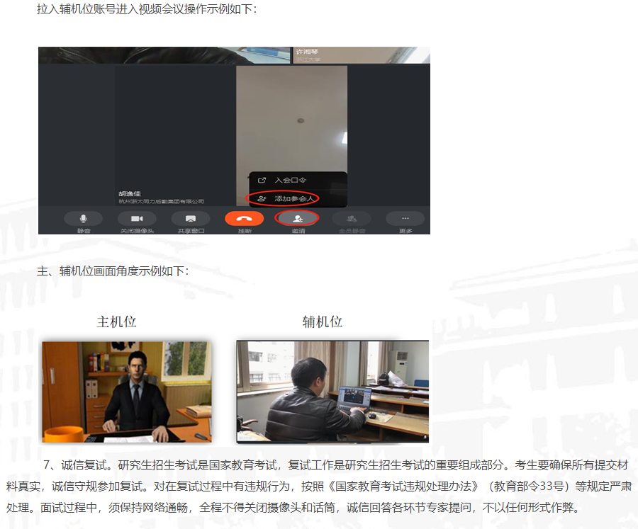 6、復(fù)試中面試候場(chǎng)。面試當(dāng)天,考生在規(guī)定時(shí)間登錄釘釘,向秘書(shū)發(fā)送釘釘消息報(bào)到后耐心等待。工作秘書(shū)會(huì)按面試順序與“注冊(cè)釘釘號(hào)”發(fā)起視頻連線。視頻接通后,考生即拉入準(zhǔn)備好的輔機(jī)位賬號(hào),并調(diào)整輔機(jī)位至合適的監(jiān)測(cè)位置,從考生背面拍攝,保證考生頭肩部、及第一臺(tái)設(shè)備的全部屏幕出現(xiàn)在視頻畫(huà)面中,輔機(jī)位開(kāi)啟靜音狀態(tài)并關(guān)閉設(shè)備的揚(yáng)聲器。面試環(huán)境檢查完成后,秘書(shū)會(huì)再次進(jìn)行身份驗(yàn)證(出示身份證、準(zhǔn)考證)。所有檢查程序完成后,保持兩個(gè)機(jī)位的視頻連接狀態(tài),等待進(jìn)入面試環(huán)節(jié)。