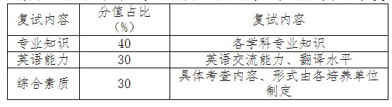 復(fù)試由各培養(yǎng)單位組織開展。復(fù)試主要是考核考生綜合運(yùn)用專業(yè)知識(shí)分析和解決問題的能力、評(píng)判思維能力、舉止和語言表達(dá)能力、人文素養(yǎng)、心理素質(zhì)等,實(shí)行百分制計(jì)分,包括專業(yè)知識(shí)、英語能力、綜合素質(zhì)。具體各項(xiàng)賦值及復(fù)試內(nèi)容見下表。