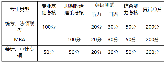 MBA:復(fù)試成績(jī)=思想政治理論考核+外語(yǔ)聽力+外語(yǔ)口語(yǔ)+綜合能力考核。復(fù)試成績(jī)總分200分。