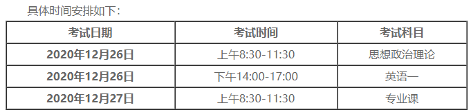 2021年全國(guó)碩士研究生招生考試初試時(shí)間為2020年12月26日至27日(每天上午8:30—11:30,下午14:00—17:00)。超過(guò)3小時(shí)的考試科目在12月28日進(jìn)行(起始時(shí)間8:30,截止時(shí)間由招生單位確定,不超過(guò)14:30)。