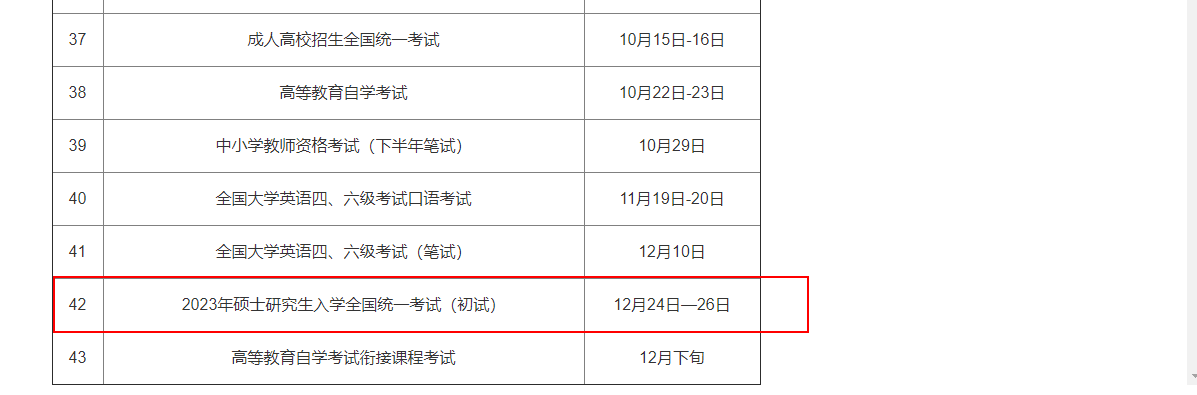目前教育部沒有發(fā)布統(tǒng)一通知,但是貴州省招生考試院公布了2023年考研初試時(shí)間,時(shí)間為2022年12月24日—26日。小編猜測(cè),2023年考研時(shí)間基本就確定為此日期,但最終考試時(shí)間還是要以研招網(wǎng)發(fā)布的信息為準(zhǔn)!