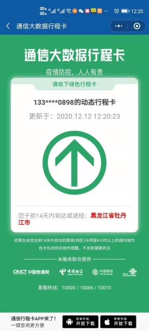 請(qǐng)考生將更新時(shí)間為2020.12.25及之后日期的行程卡(如下)打印并寫好身份證號(hào)、考生編號(hào)及本人簽名,26日考試當(dāng)天進(jìn)入考點(diǎn)正門時(shí)交給考務(wù)人員留存。