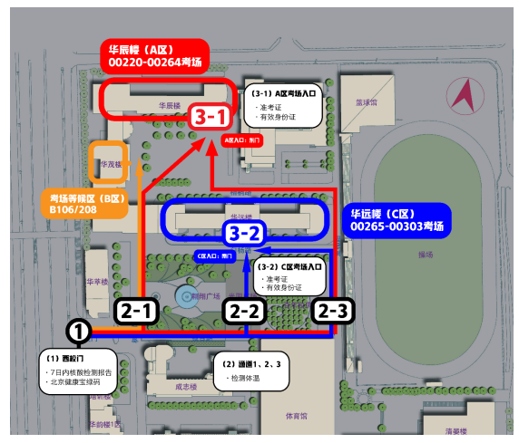 (3)A 區(qū)考生在圖示 3-1 處 A 區(qū)考場入口、C 區(qū)考生在圖示 3-2 處 C 區(qū)考場入口出示準(zhǔn)考證和有效身份證。 相關(guān)材料攜帶不全或無法確認(rèn)身份真實(shí)性的考生不得進(jìn)入。入 場后在考試結(jié)束之前不允許離開考場??荚嚻陂g,各考場樓禁止 其他人員入內(nèi)。 考生(包括清華大學(xué)校內(nèi)和清華附中考試的考生)進(jìn)入考場 前須佩戴口罩,聽從考試工作人員指揮,配合完成體溫測量等健 康檢查,排隊(duì)過程中請保持間距。進(jìn)入校園后,請按路線圖和指 示標(biāo)志直接前往考場樓,不要在其他區(qū)域活動(dòng)或逗留,以免錯(cuò)過 入場時(shí)間。