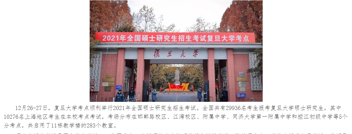 全國共有29936名考生報考復旦大學碩士研究生,其中10276名上海地區(qū)考生在本校考點考試,考場分布在邯鄲路校區(qū)、江灣校區(qū)、附屬中學、同濟大學第一附屬中學和控江初級中學等5個分考點,共啟用了11棟教學樓的283個教室。