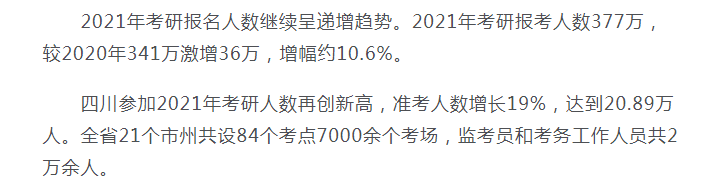 四川參加2021年考研人數(shù)再創(chuàng)新高,準(zhǔn)考人數(shù)增長(zhǎng)19%,達(dá)到20.89萬(wàn)人。