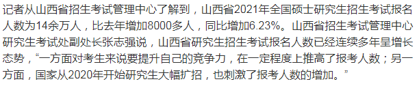 山西省2021年全國碩士研究生招生考試報名人數(shù)為14余萬人,比去年增加8000多人,同比增加6.23%。