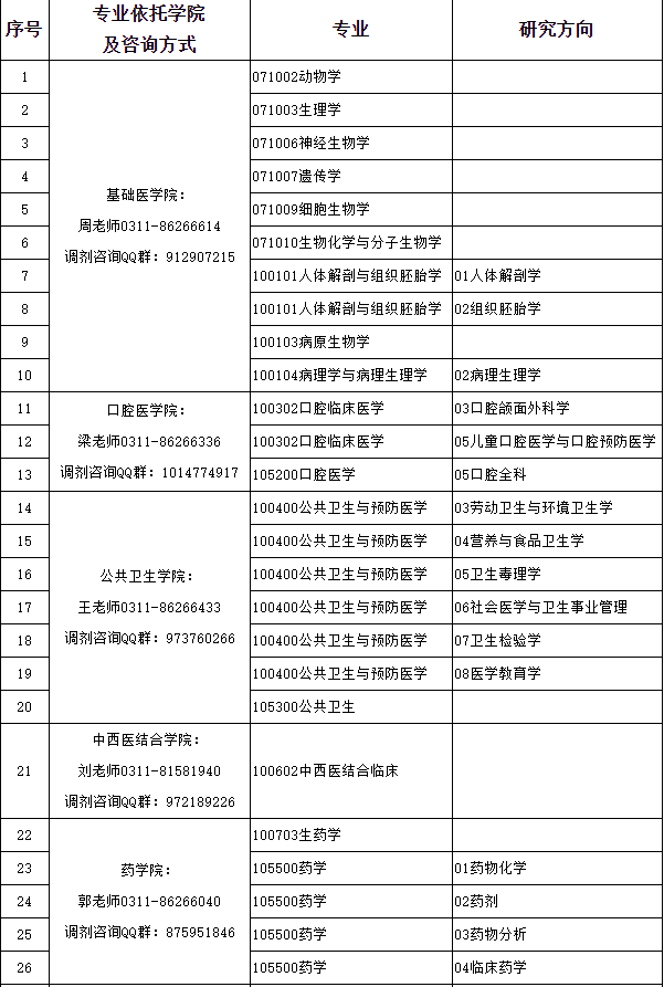 根據(jù)《2020年全國碩士研究生招生考試考生進(jìn)入復(fù)試的初試成績基本要求》及我校第一志愿考生初試基本情況的綜合分析,我校2020年部分專業(yè)將接受考生調(diào)劑(詳見附表)。根據(jù)《教育部關(guān)于印發(fā)<2020年全國碩士研究生招生工作管理規(guī)定>的通知》(教學(xué)函〔2019〕6號)和《教育部辦公廳關(guān)于做好碩士研究生招生調(diào)劑工作的通知》(教學(xué)廳函〔2018〕14號)等文件要求,我校接收所有調(diào)劑考生,不分校內(nèi)、校外調(diào)劑,所有調(diào)劑考生均須通過教育部指定的“全國碩士生招生調(diào)劑服務(wù)系統(tǒng)”進(jìn)行調(diào)劑,系統(tǒng)預(yù)計5月20日開通。調(diào)劑程序、各專業(yè)(領(lǐng)域)調(diào)劑缺額數(shù)量和要求、復(fù)試辦法等將在“五一”節(jié)后陸續(xù)公布,請考生及時關(guān)注河北醫(yī)科大學(xué)研究生學(xué)院官網(wǎng)招生信息。