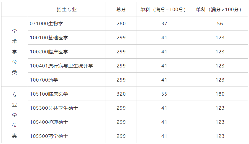 2021年碩士研究生考試成績及國家線已出。根據(jù)相關(guān)規(guī)定并結(jié)合汕頭大學醫(yī)學院實際,臨床醫(yī)學碩士專業(yè)學位分數(shù)線劃定總分為320分,單科分數(shù)線為55分、180分;其他各專業(yè)分數(shù)線按國家線(A類)執(zhí)行。詳見下表: