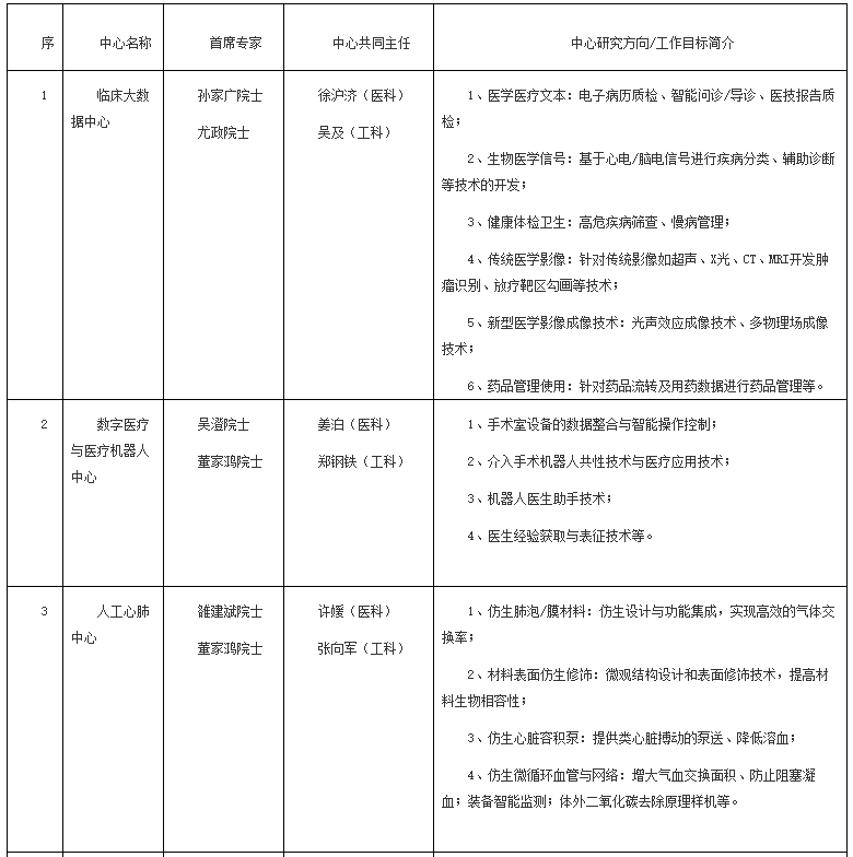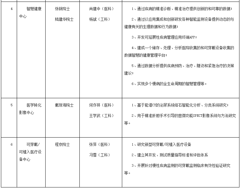 精準(zhǔn)醫(yī)學(xué)研究院(以下簡稱“研究院”)以清華大學(xué)附屬北京清華長庚醫(yī)院和清華大學(xué)工程物理系作為共建單位,實行管理委員會領(lǐng)導(dǎo)下的院長負責(zé)制。清華大學(xué)在醫(yī)學(xué)科學(xué)與工程技術(shù)領(lǐng)域的著名專家尤政、孫家廣、吳澄、張鈸、雒建斌、程京、董家鴻、陸建華、戴瓊海9位院士抓大局、把方向,作為研究院下設(shè)六大醫(yī)工結(jié)合研究中心的首席專家,為醫(yī)科和工科共同主任領(lǐng)導(dǎo)下的各中心進行頂層設(shè)計。六大醫(yī)工結(jié)合研究中心包括:臨床大數(shù)據(jù)中心、數(shù)字醫(yī)療與醫(yī)療機器人中心、人工心肺中心、智慧健康中心、醫(yī)學(xué)轉(zhuǎn)化影像中心和可穿戴/可植入醫(yī)療設(shè)備中心(表1)。研究院科研項目管理實行雙PI新機制,由醫(yī)科和工科PI共同開展課題研究,基于CDR(Clinical Driven Research)理念,旨在以國民健康醫(yī)療需求為導(dǎo)向,聚焦重大疾病防治,針對重點共性技術(shù)問題攻堅克難,充分發(fā)揮清華大學(xué)多學(xué)科優(yōu)勢,整合清華大學(xué)附屬醫(yī)院及全國各大醫(yī)療體系的優(yōu)質(zhì)臨床醫(yī)學(xué)資源,提高精準(zhǔn)醫(yī)學(xué)研究水平,培養(yǎng)具有臨床轉(zhuǎn)化科學(xué)背景的復(fù)合型醫(yī)學(xué)人才和工科人才。