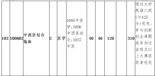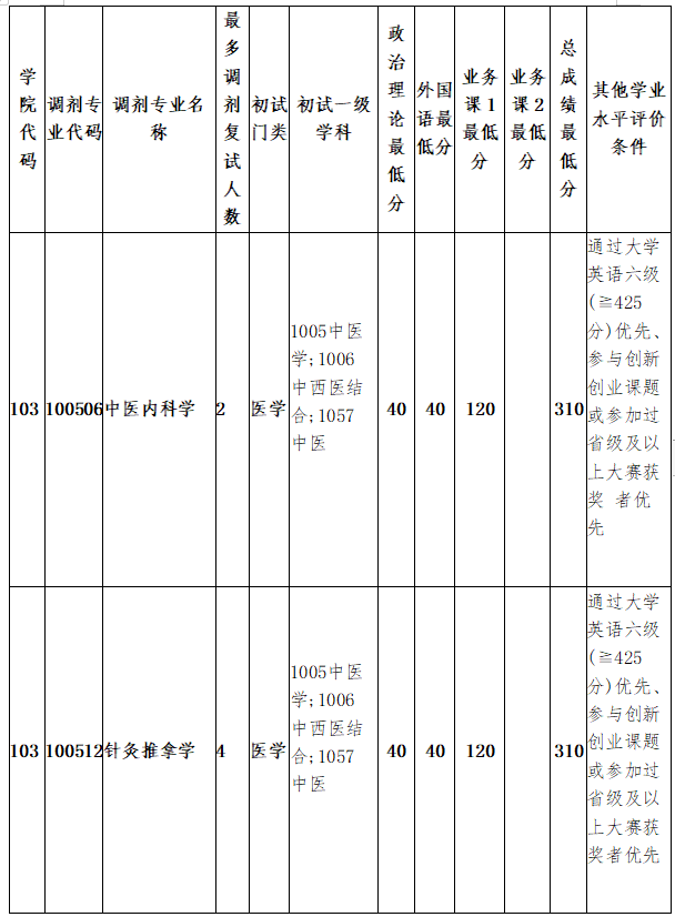5.中醫(yī)專業(yè)學(xué)位各調(diào)劑專業(yè)要求初試總成績(jī)不低于330分,英語(yǔ)/思想政治理論不低于45分,業(yè)務(wù)課1不低于180分。報(bào)考臨床醫(yī)學(xué)類專業(yè)學(xué)位碩士研究生的考生可按相關(guān)政策調(diào)劑到其他專業(yè),報(bào)考其他專業(yè)(含醫(yī)學(xué)學(xué)術(shù)學(xué)位)的考生不可調(diào)劑到臨床醫(yī)學(xué)類專業(yè)學(xué)位。