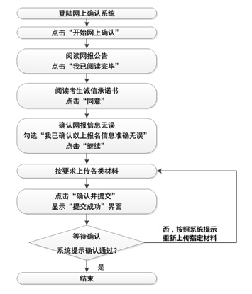 1.考生須提前準(zhǔn)備好網(wǎng)上確認(rèn)材料,便于順利進(jìn)行網(wǎng)上確認(rèn)。考生上傳材料成功后,請等待審核并及時登錄網(wǎng)上確認(rèn)系統(tǒng)查看審核結(jié)果,如未通過審核,應(yīng)根據(jù)提示重新提交相關(guān)材料。