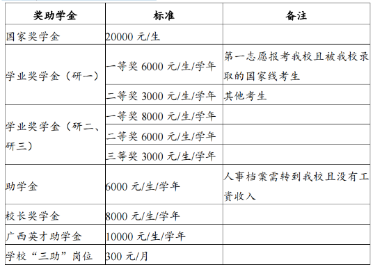 (二)獎(jiǎng)助學(xué)金:我校將按照國(guó)家最新規(guī)定,設(shè)立國(guó)家獎(jiǎng)學(xué)金、國(guó)家助 學(xué)金、學(xué)業(yè)獎(jiǎng)學(xué)金、校長(zhǎng)獎(jiǎng)學(xué)金、廣西英才助學(xué)金、三助崗位,建立多元獎(jiǎng) 助體系,支持碩士生完成學(xué)業(yè)。