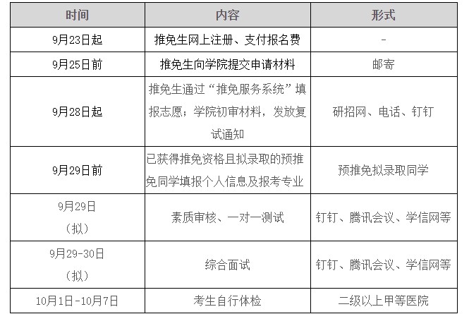 2、根據(jù)教育部推免工作安排,9月23日起,申請(qǐng)人通過教育部“全國(guó)推薦優(yōu)秀應(yīng)屆本科畢業(yè)生免試攻讀研究生信息公開暨管理服務(wù)系統(tǒng)”(以下簡(jiǎn)稱“推免服務(wù)系統(tǒng)”,網(wǎng)址:)進(jìn)行注冊(cè)并填報(bào)個(gè)人資料信息。9月28日~10月20日,推免生通過“推免服務(wù)系統(tǒng)”填報(bào)志愿、接收并確認(rèn)招生單位的復(fù)試及待錄取通知,如開通時(shí)間有變化,以實(shí)際開通為準(zhǔn)。
