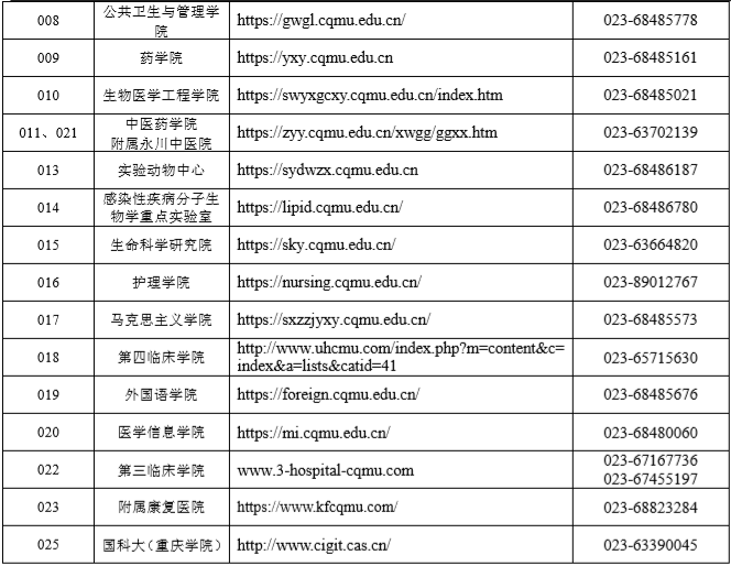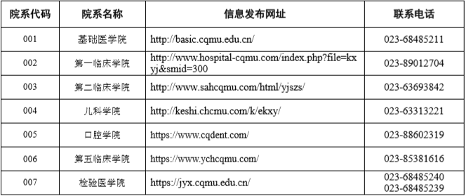 (七)有關我校碩士研究生報名、考試、復試、錄取、導師等信息,將在我校研究生招生網(wǎng)站發(fā)布(網(wǎng)址: http://yjszs.cqmu.edu.cn),請考生注意上網(wǎng)查詢,以免遺漏重要信息。研究生招生辦公室咨詢電話: 023-68485540,郵寄地址:重慶市渝中區(qū)醫(yī)學院路 1 號重慶醫(yī)科大學研究生招生辦公室,郵編 400016。