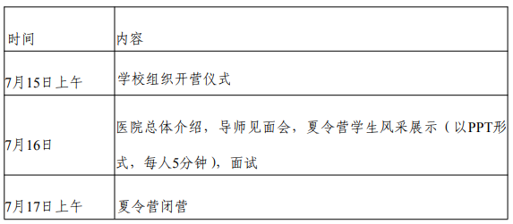 1.獲得優(yōu)秀營員者,如獲得所在學(xué)校的研究生推薦 免試資格, 報(bào)考相同專業(yè)、學(xué)位類型可優(yōu)先擬錄取為 我院推薦免試碩士研究生;如未獲得所在學(xué)校的研究生 推薦免試資格,但通過參加全國統(tǒng)考碩士研究生,報(bào)考 相同專業(yè)、學(xué)位類型,考試成績達(dá)到我校同年該專業(yè)復(fù) 試基本分?jǐn)?shù)線(含總分、單科分?jǐn)?shù))標(biāo)準(zhǔn)后,需參加復(fù) 試資格審查、體檢和心理測試,審查合格后將不再參加 時(shí)間 內(nèi)容 7月15日上午 學(xué)校組織開營儀式 7月16日 醫(yī)院總體介紹,導(dǎo)師見面會(huì),夏令營學(xué)生風(fēng)采展示(以PPT形 式,每人5分鐘),面試 7月17日上午 夏令營閉營 復(fù)試其他環(huán)節(jié),優(yōu)先擬錄取。