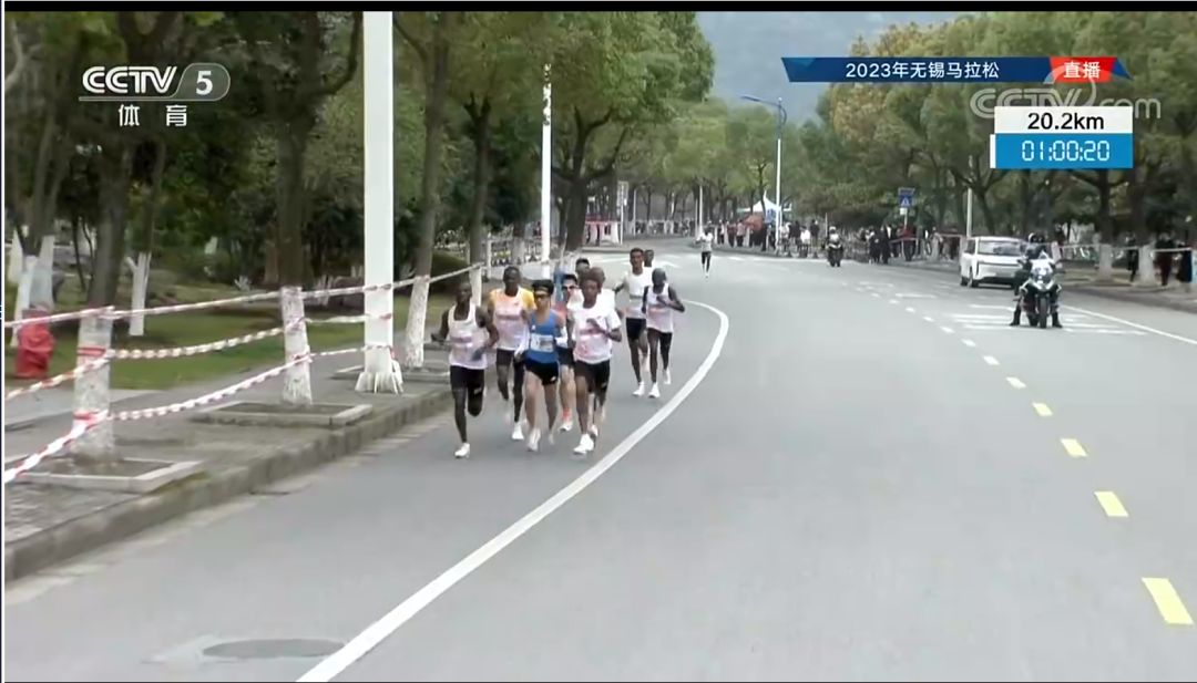 10km耗時(shí)29分鐘,16 km耗時(shí) 47分鐘,配速一直保持2分53秒左右,速度很快但節(jié)奏很好。20km過后,第一集團(tuán)稍稍掉速,20.2 km耗時(shí)1小時(shí)0分20秒,配速約為3分幾秒。