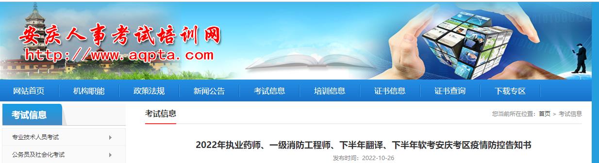 2022年執(zhí)業(yè)藥師資格考試、一級(jí)注冊(cè)消防工程師資格考試、下半年翻譯專業(yè)資格(水平)考試、計(jì)算機(jī)技術(shù)與軟件專業(yè)技術(shù)資格(水平)考試(安慶考區(qū))將于11月5日、6日舉行。為確保本次考試安全有序進(jìn)行,現(xiàn)就疫情防控有關(guān)事項(xiàng)告知如下: