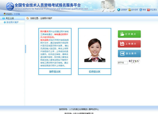 進(jìn)入照片維護(hù)頁面,點(diǎn)擊【打開照片】按鈕,選擇經(jīng)過【照片審核】工具處理過的照片,照片會(huì)顯示在信息提示區(qū),輸入驗(yàn)證碼,點(diǎn)擊【上傳照片】按鈕,彈出提示框,選擇【確定】按鈕,照片上傳成功(見下圖)。