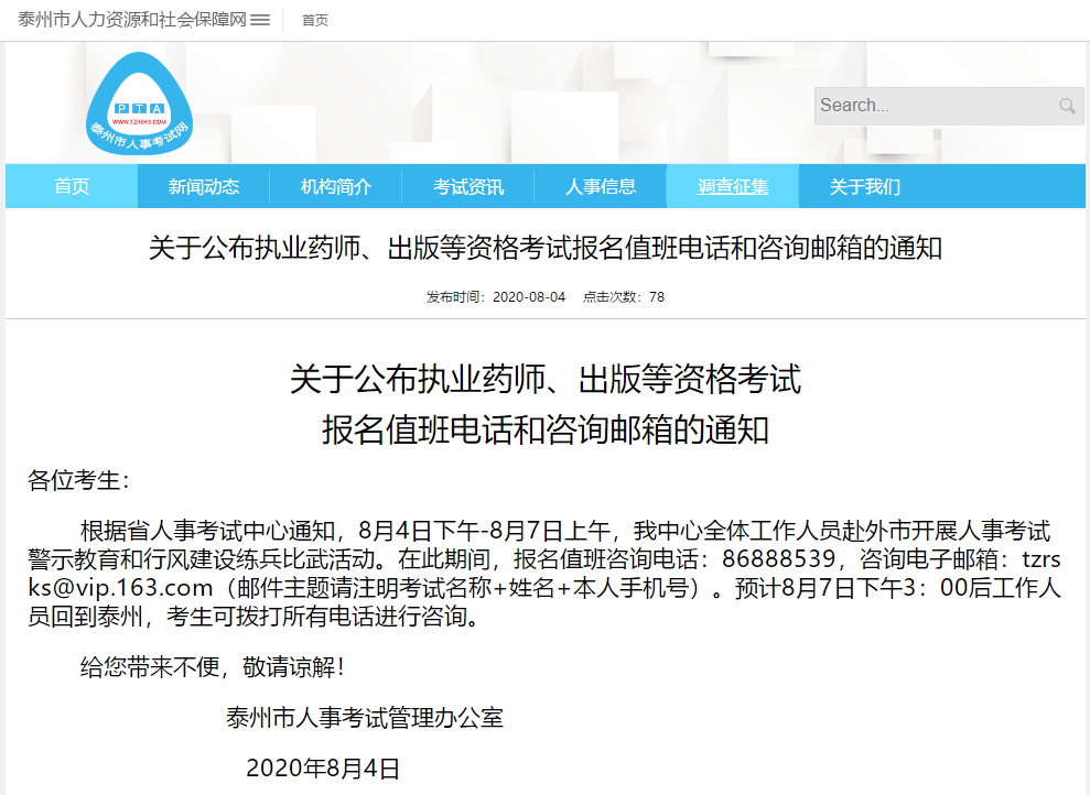 以上就是“江蘇泰州!關(guān)于公布執(zhí)業(yè)藥師、資格考試報名值班電話和咨詢郵箱的通知”的詳細內(nèi)容,希望可以對大家有幫助!