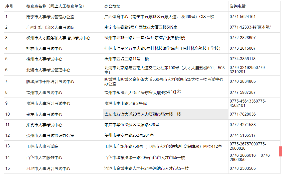 全區(qū)人事考試機構(gòu)(核查點)地址及聯(lián)系方式如下: