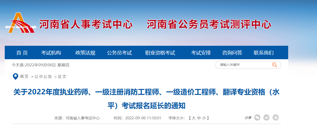 關(guān)于2022年度執(zhí)業(yè)藥師、一級注冊消防工程師、一級造價工程師、翻譯專業(yè)資格(水平)考試報名延長的通知