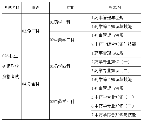 藥學(xué)類考試科目:“藥學(xué)專業(yè)知識(一)”“藥學(xué)專業(yè)知識(二)”“藥事管理與法規(guī)”“藥學(xué)綜合知識與技能”。