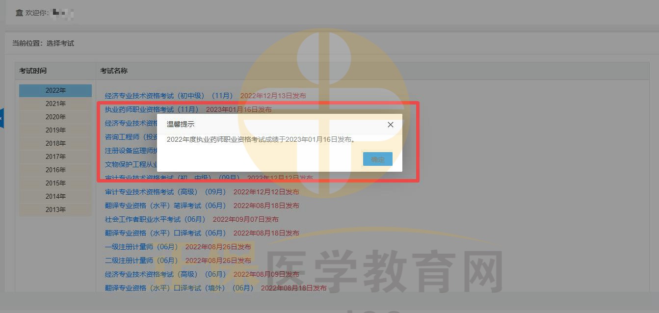 2022年執(zhí)業(yè)藥師考試成績查詢入口已于2023年1月16日發(fā)布。