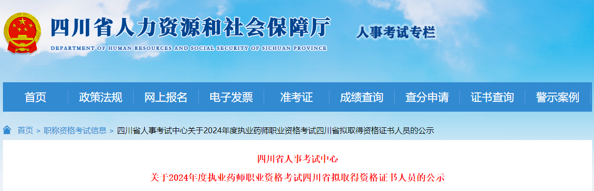 【四川】2024年執(zhí)業(yè)藥師考試擬取得資格證書人員的公示