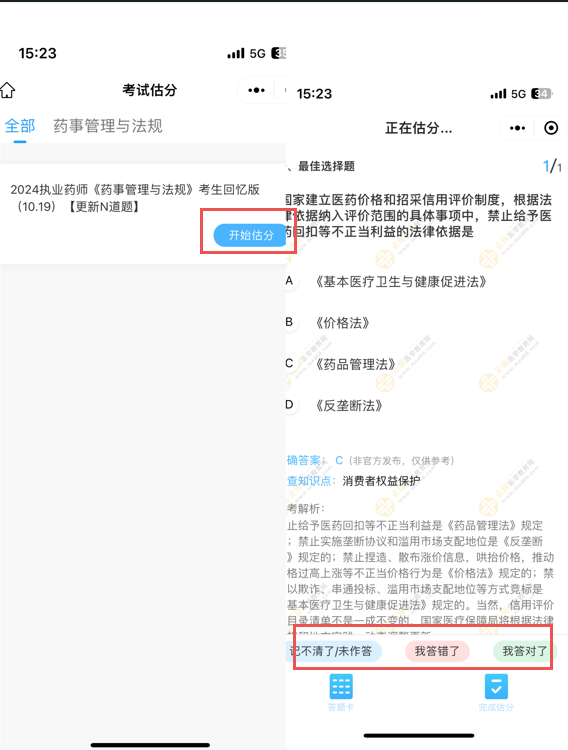 進(jìn)入“正保官方小助手”小程序后,在頂部進(jìn)入“2025年職業(yè)藥師考后估分入口”,選擇對應(yīng)考試科目,比如“藥事管理與法規(guī)”,根據(jù)自己考試的真實(shí)你的實(shí)際考試情況,選擇“我答對了”或“我答錯(cuò)了”,如不是自己考試的試題則選擇“記不清了/未作答”。