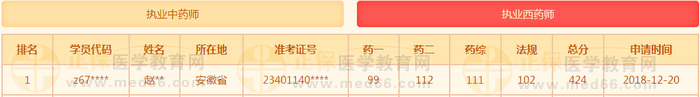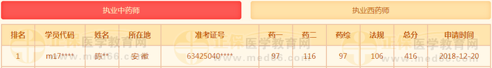 來(lái)看看這兩位執(zhí)業(yè)藥師學(xué)霸的成績(jī),西藥學(xué)霸z67****總分424,最低分99分!中藥學(xué)霸:m17****總分416,最低分97!看的小編都心存敬意,是真學(xué)霸呀,聽(tīng)說(shuō)你的成績(jī)比他還要好?趕快讓小編我開(kāi)看眼界吧!
