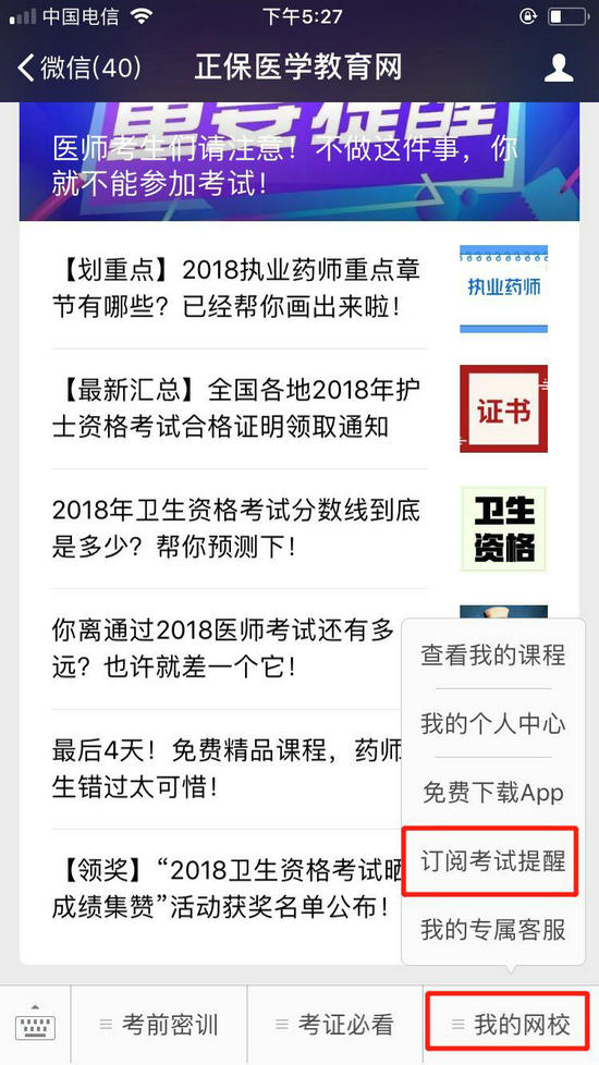 2019年執(zhí)業(yè)藥師考生最關(guān)注的是成績(jī)什么時(shí)候公布,為方便考生快速查成績(jī),現(xiàn)在可以訂閱醫(yī)學(xué)教育網(wǎng)微信提醒,一鍵訂閱,自動(dòng)提醒,不用您在電腦前苦苦刷新中國(guó)人事考試網(wǎng)了,只要一鍵訂閱,成績(jī)公布時(shí),微信自動(dòng)收到成績(jī)查詢提醒,下面來(lái)看看如何微信訂閱2019執(zhí)業(yè)藥師考試成績(jī)查詢吧。