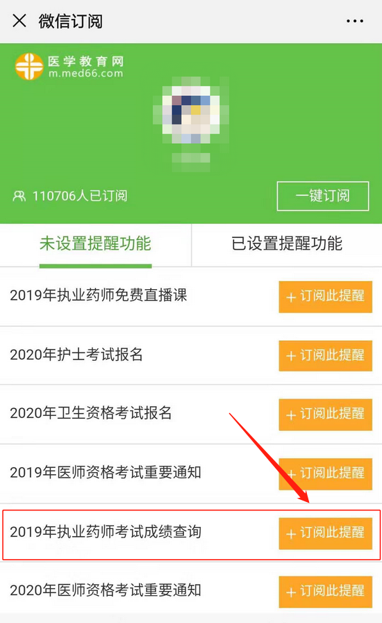 3. 訂閱"2019執(zhí)業(yè)藥師考試成績(jī)查詢"提醒功能