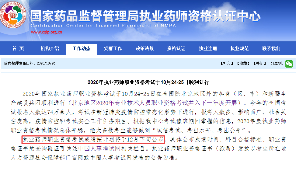 中國人事考試網(wǎng)在10月25日開通了2020年執(zhí)業(yè)藥師考試成績查詢入口。