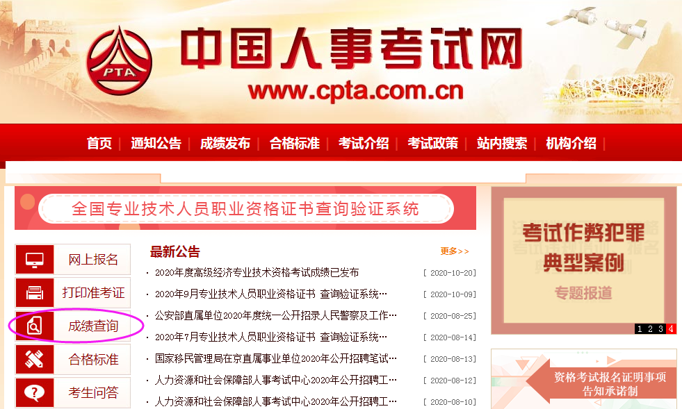 1、進(jìn)入中國(guó)人事考試網(wǎng),點(diǎn)擊左側(cè)“成績(jī)查詢(xún)”,進(jìn)入到成績(jī)查詢(xún)頁(yè)面
